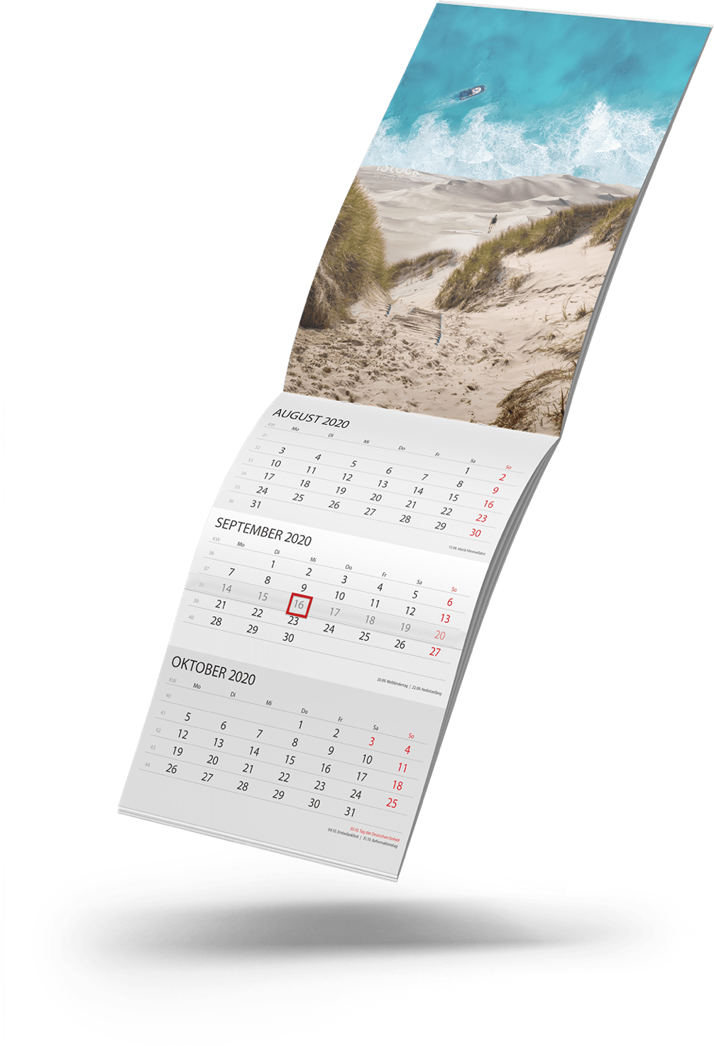 Unser 3-Monatskalender bietet die beste Übersicht, sowohl über vergangene als auch die bevorstehenden Wochen. Dennoch zeigt er Monat für Monat ein neues Motiv. Das aktuelle Tagesdatum können Sie dabei mit einem verschiebbaren Marker kennzeichnen.